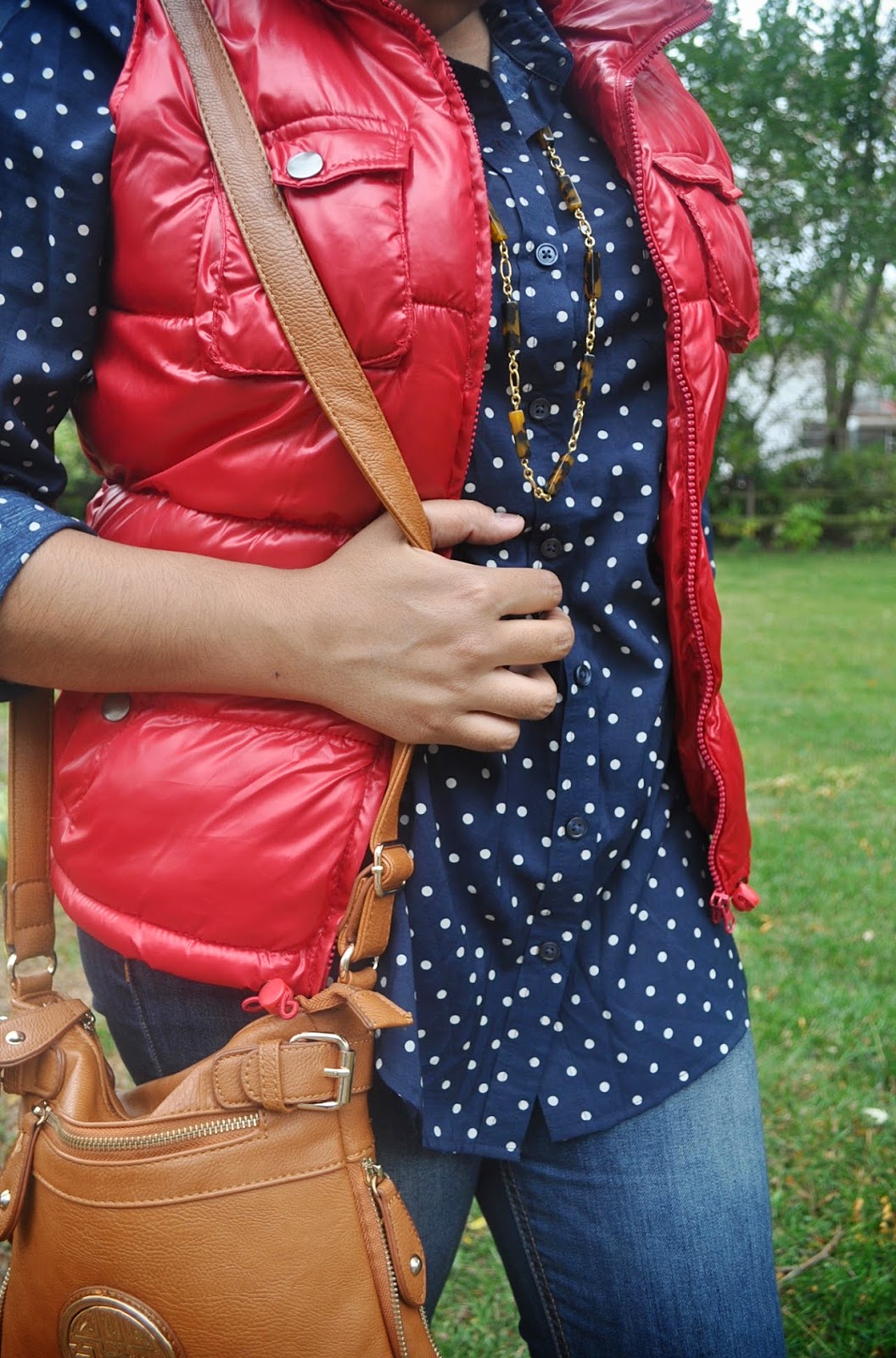 To dress the color down, I choose a simple cotton shirt with cute little polka dots and kept it casual with jeans and brown booties. Because I love layers in the Fall I added a pop of red with a fun puffer vest that I found recently. Tortoise shell jewelry really complemented my look so I paired my long necklace with my earrings.